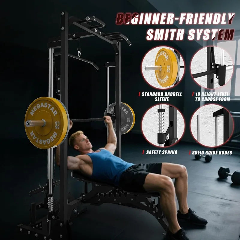 Compact Smith Machine Home Gym - 800lb Barbell Sleeve, Space-Saving Power Cage with LAT Pulldown, Power Rack 5-in-1