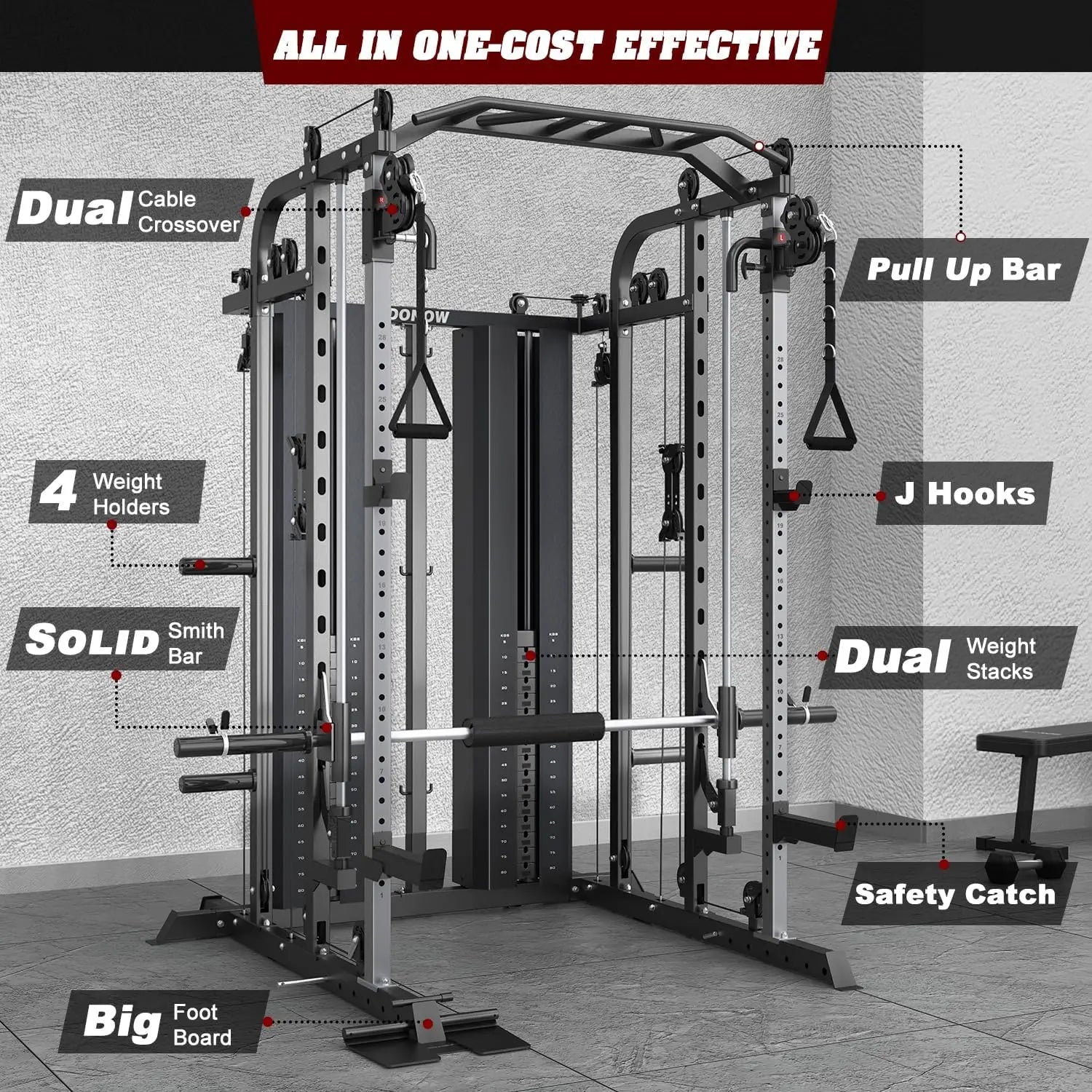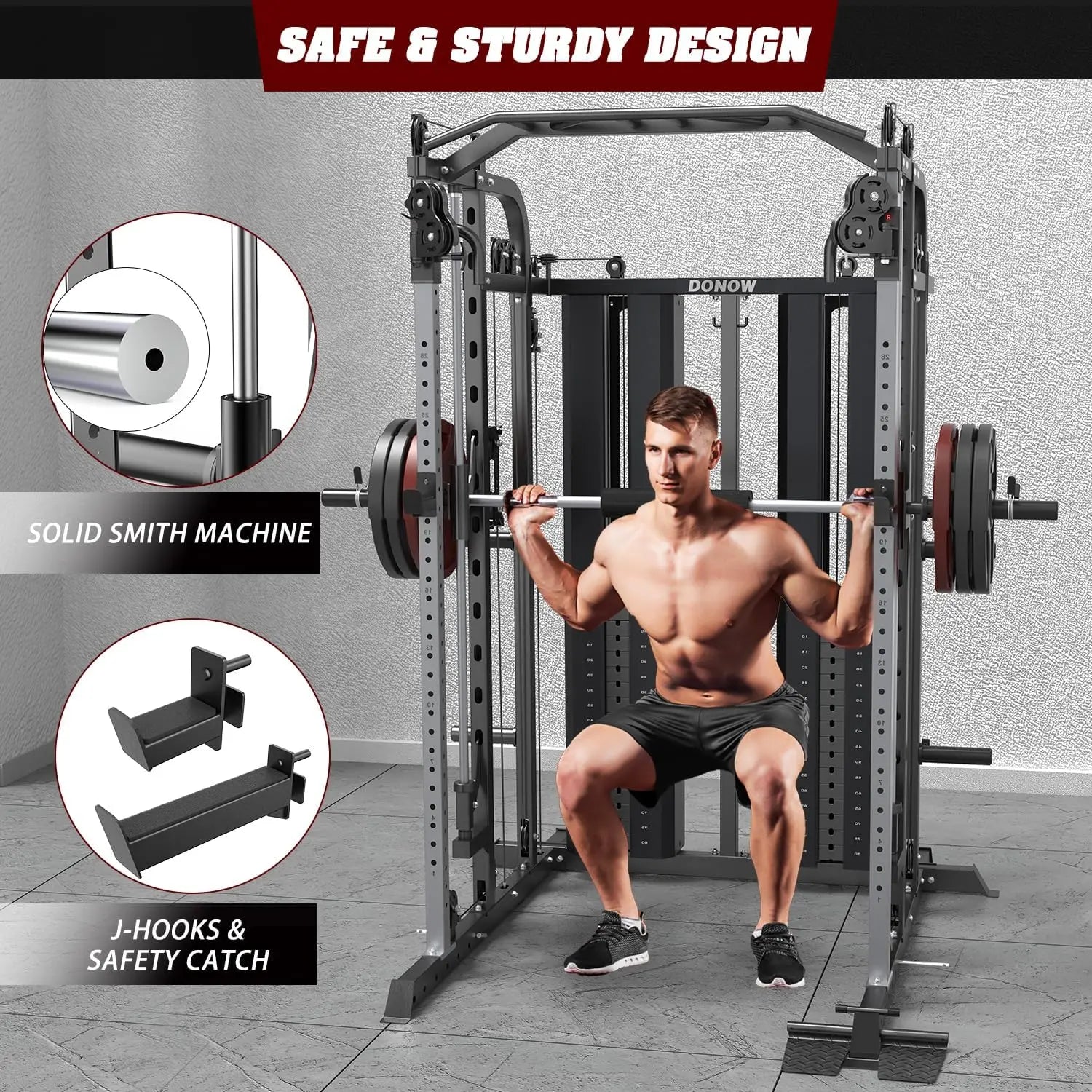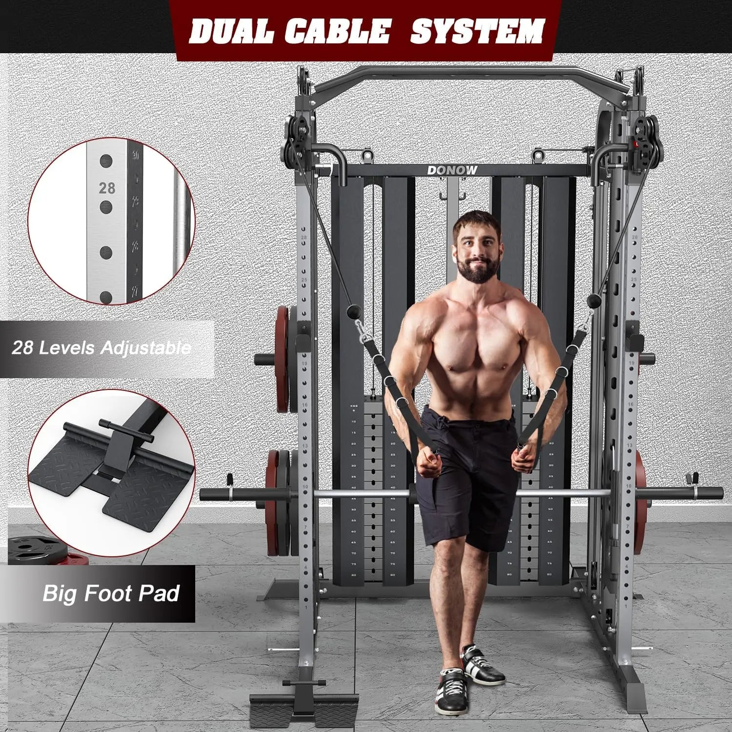 - HOME GYM SYSTEM: DONOW home gym machine is equipped with dual individual cable crossover systems which provides you various training needs. The cage also features two SOLID smith guide rods, two widened safety catches, padded smith bar, wide-narrow pull up bar and texture foot-board to ensure you a comfortable and enjoyable workout experience.