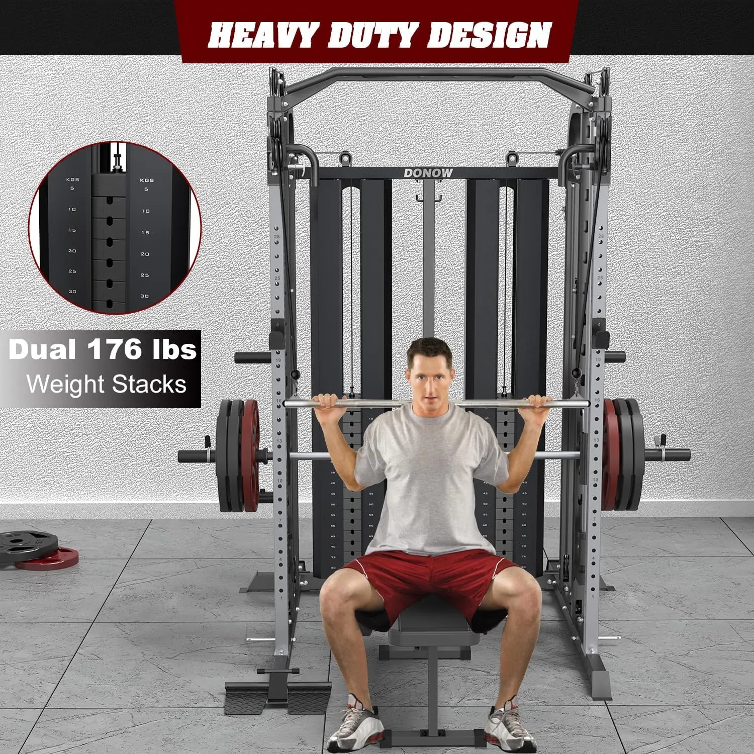 - ADJUSTABLE 353LBS WEIGHT STACKS: DONOW smith machine is built for long-lasting, intensive use. It includes 353lbs/160kg weight stacks (dual 80kg on each side). Two weight pegs let you organize weights on the machine for easy accessibility. Weight Plate are not included.