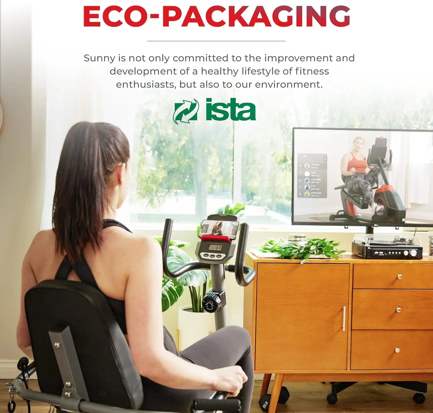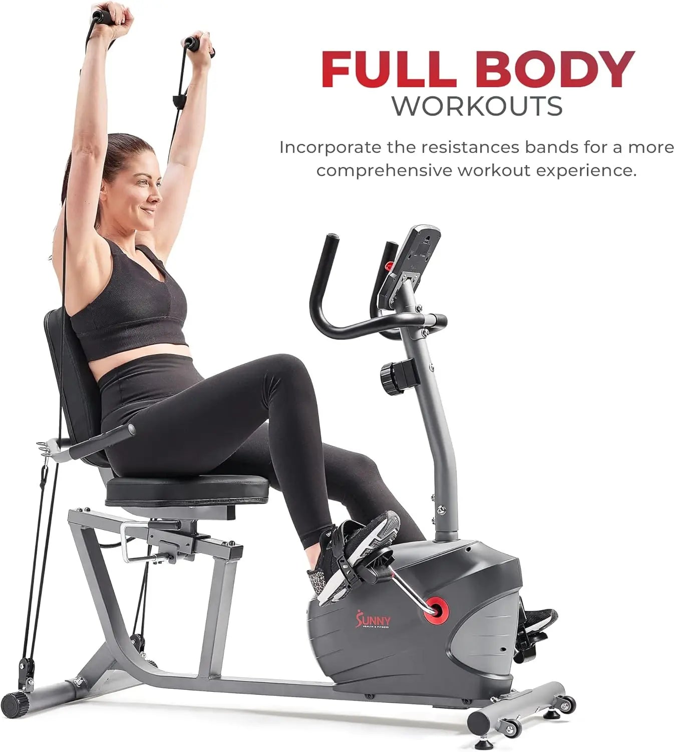 - 【SMART RECUMBENT BIKE + ARM EXERCISER】Sync with the SUNNYFIT app and enjoy full-body training with the included resistance bands, while benefiting from the quiet magnetic resistance. Track your progress on the digital monitor with pulse sensors, all while staying comfortable on the extra-wide, padded seat.